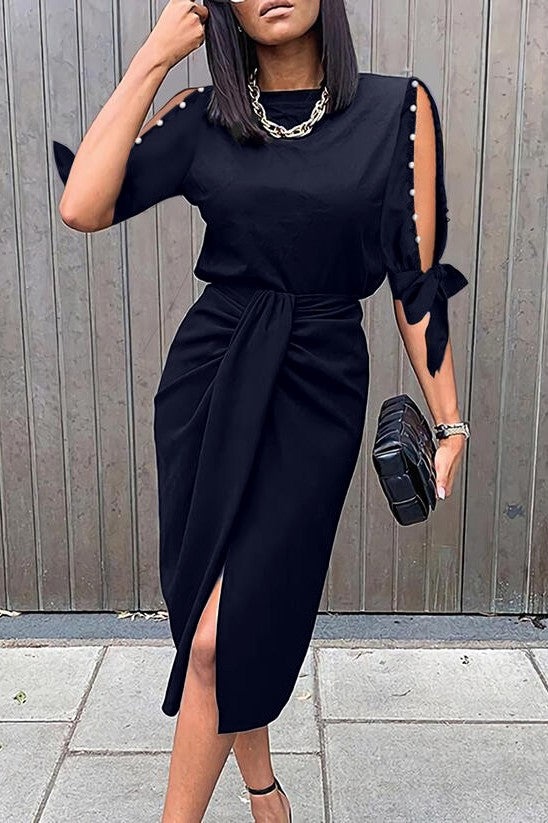 Abito elegante midi con scollo rotondo, maniche 3/4 con spacco e perline decorative Peppina, nero
