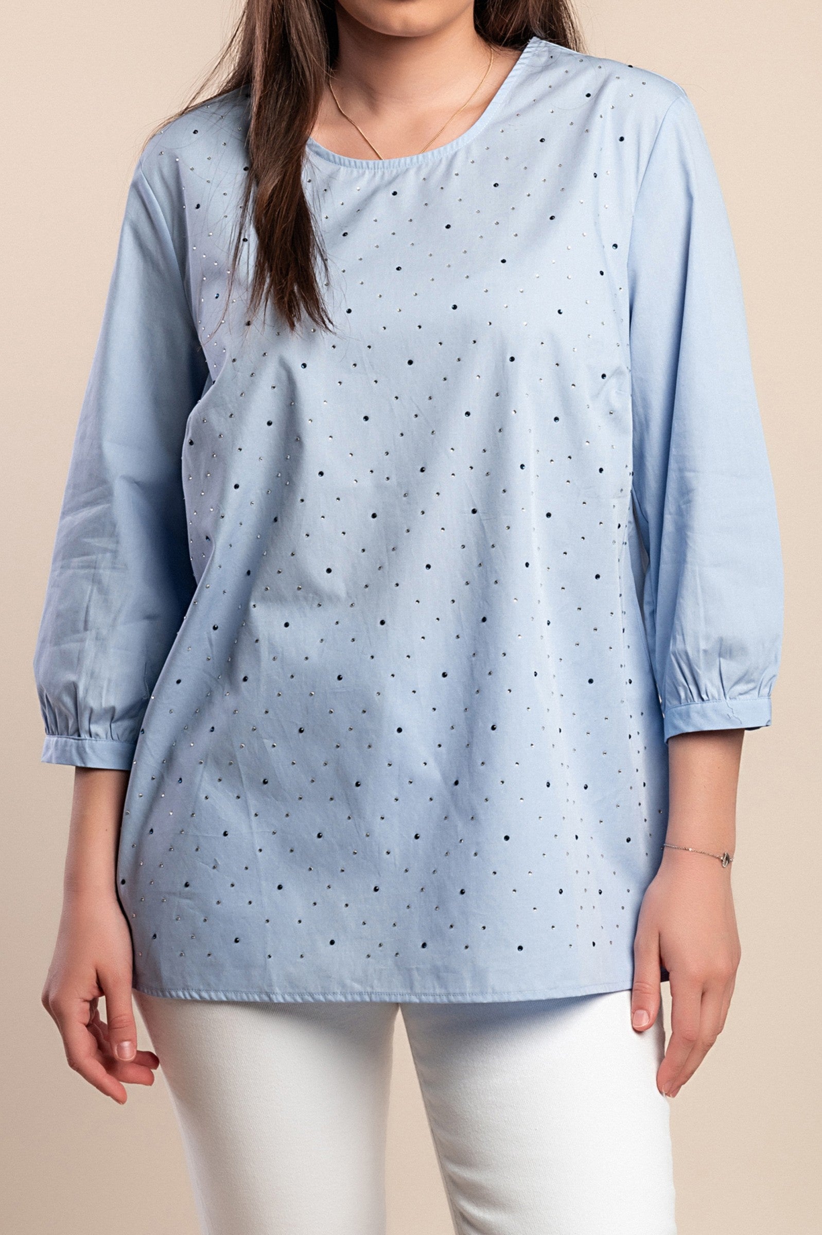 Camicetta in cotone con ricami, taglie forti, azzurra
