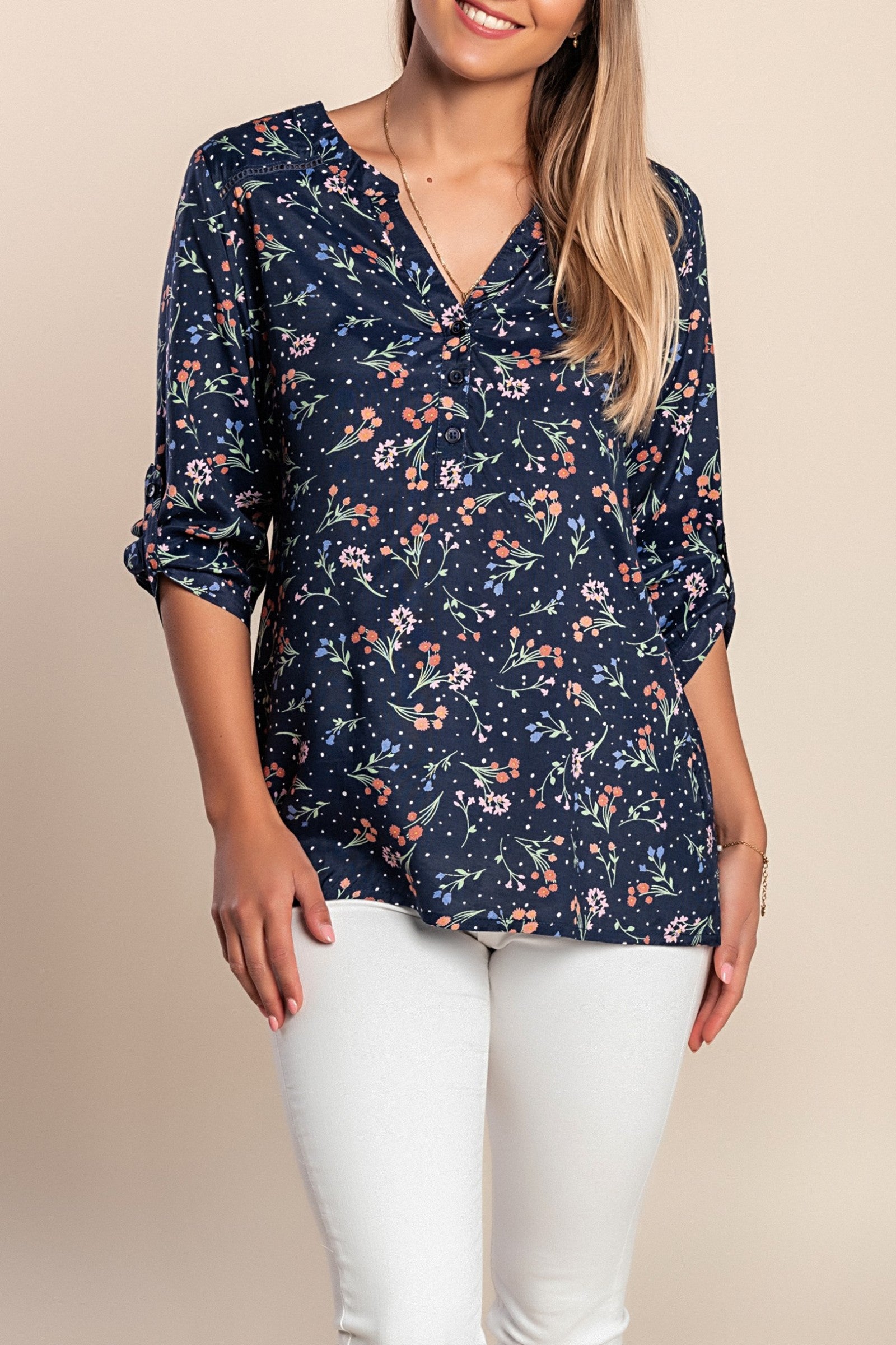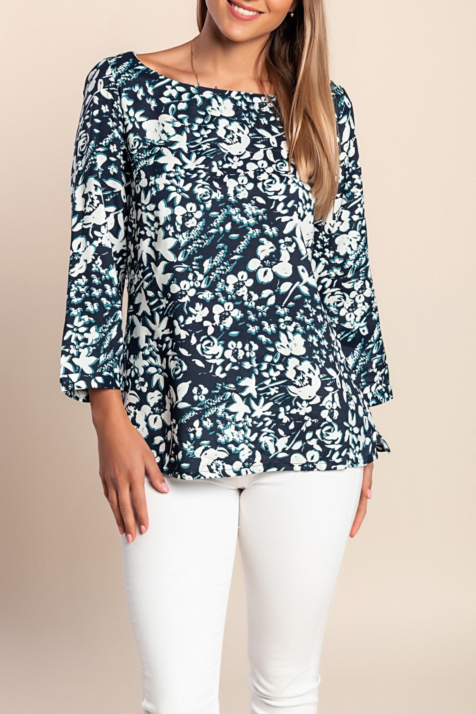 Camicetta taglie forti con stampa floreale, blu scuro