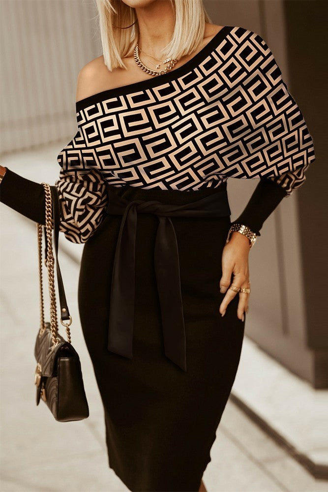Abito midi elegante con scollo a barca e stampa geometrica Serenna, nero