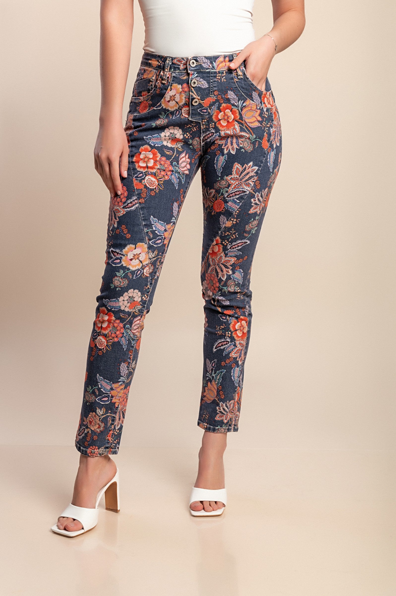 Jeans con stampa floreale, rossi