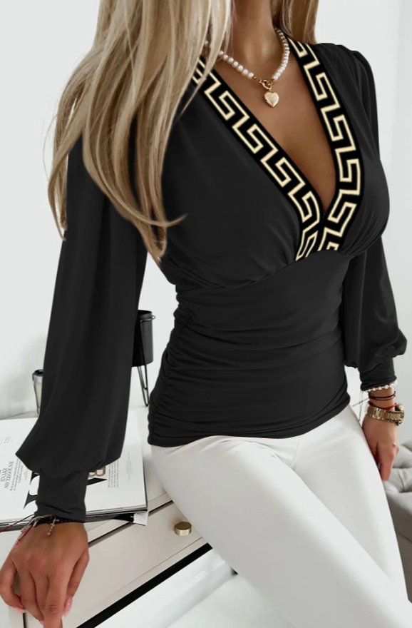 Top con stampa geometrica, nera e beige