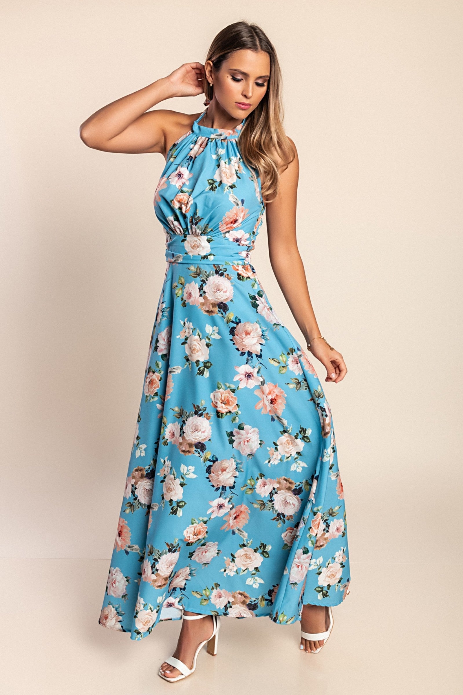Abito lungo con stampa floreale, azzurro