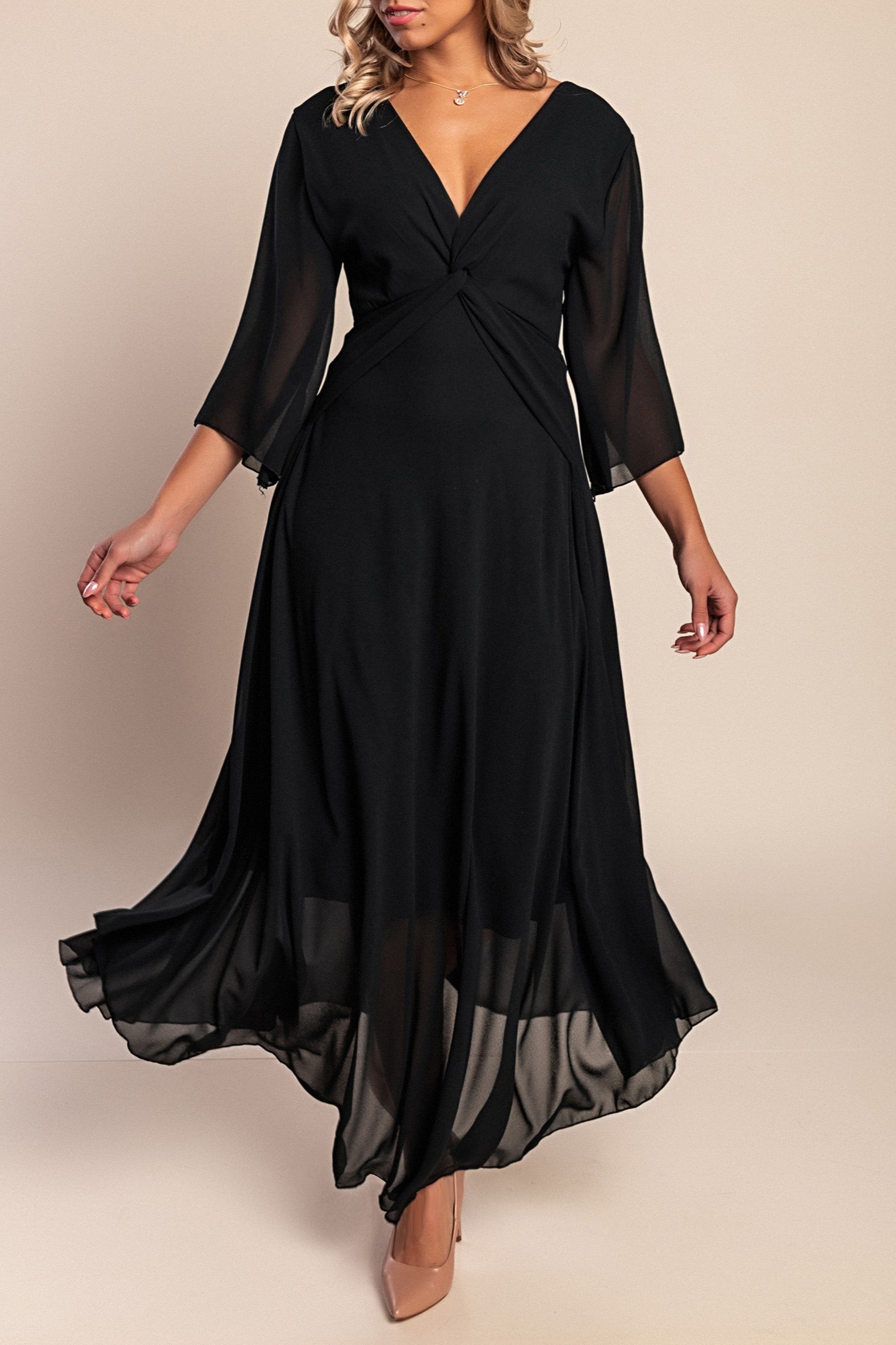 Abito lungo dal taglio ampio con scollo a "V", maniche corte con volant e spacchi Mandelina, nero