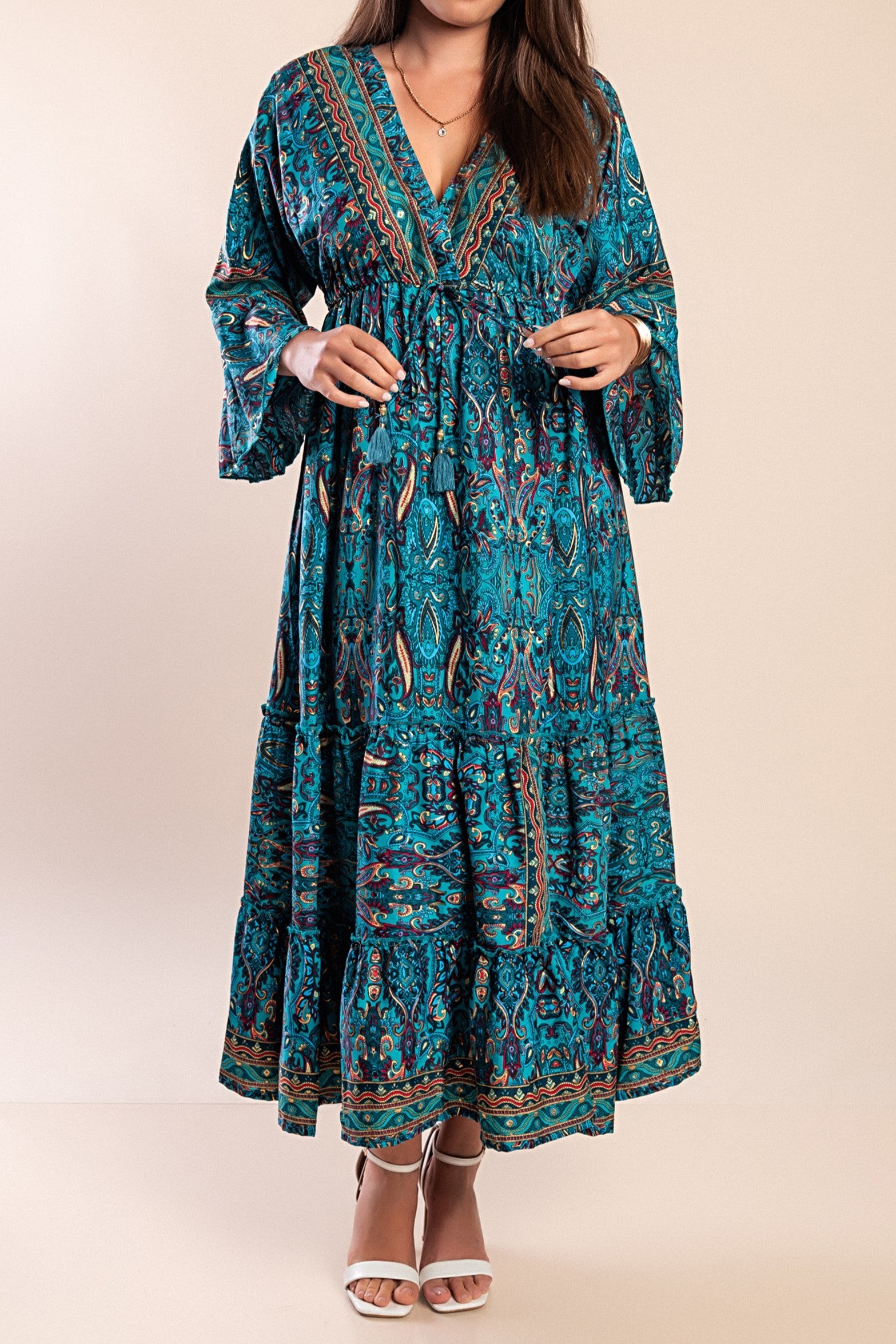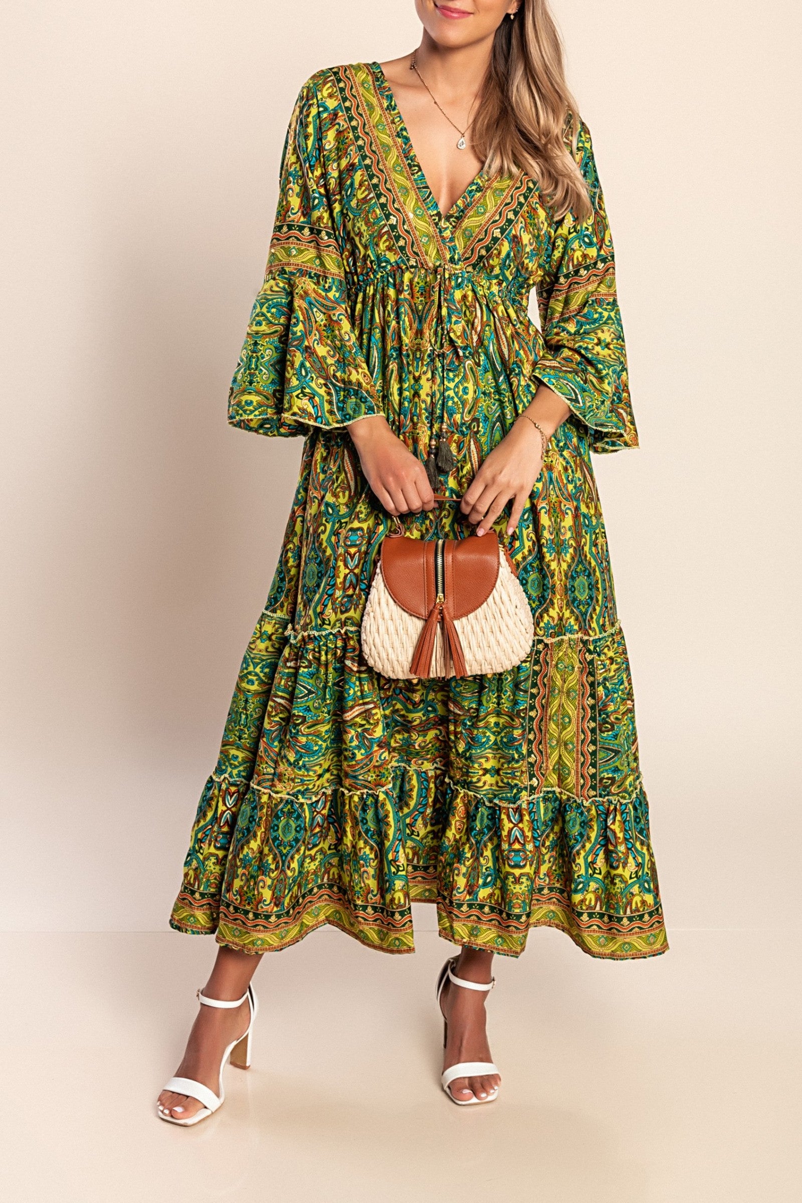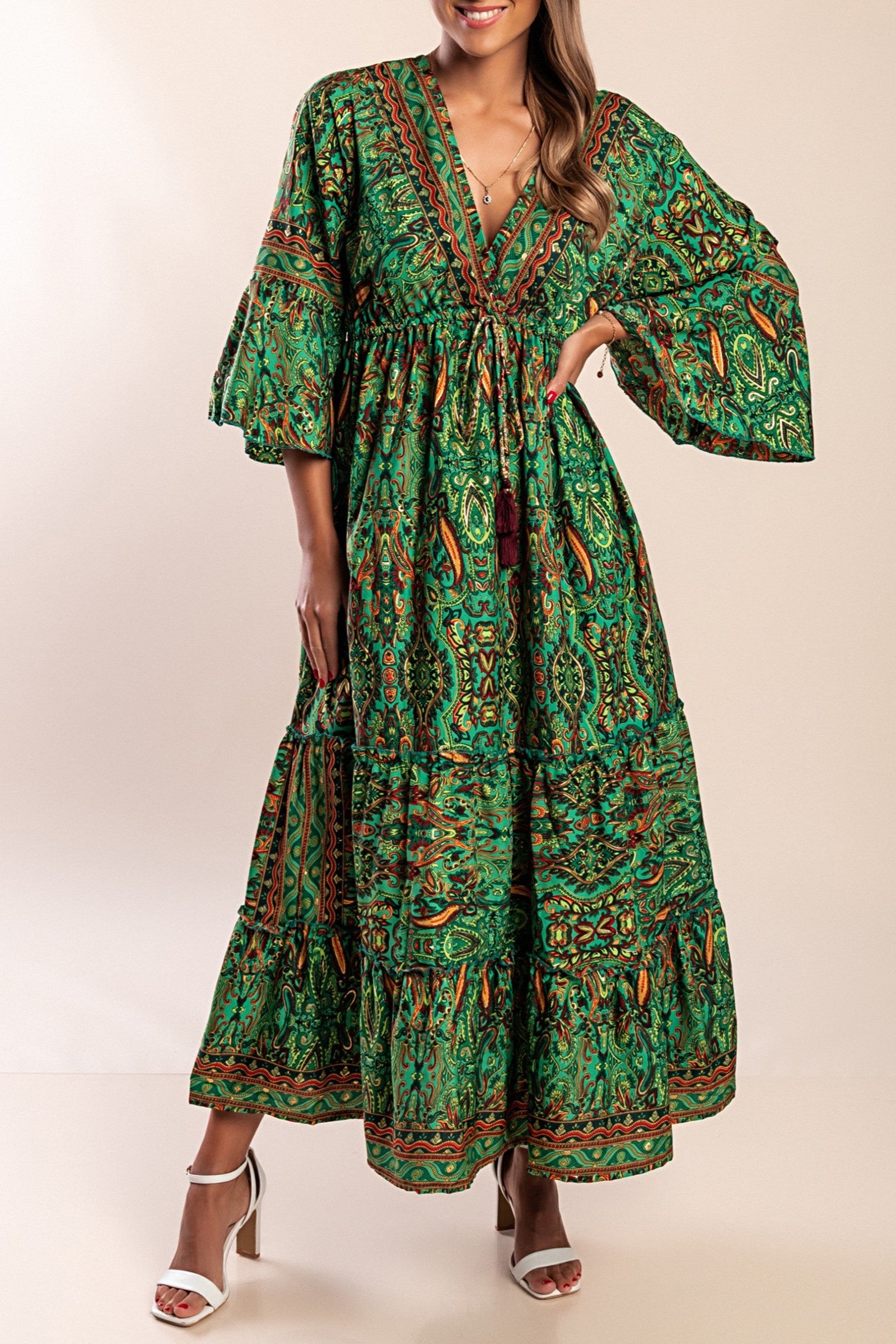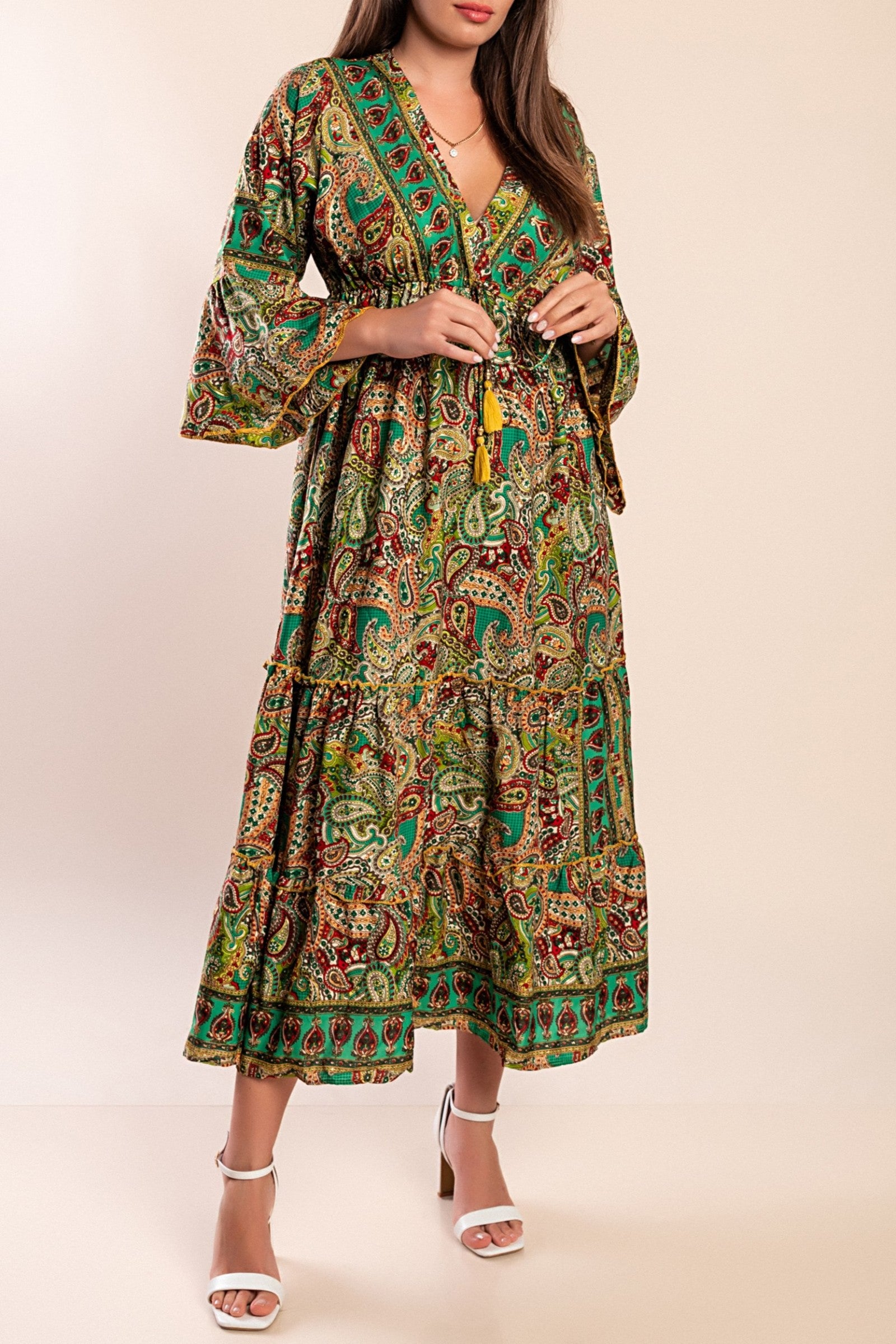 Abito lungo con scollo a V, verde scuro