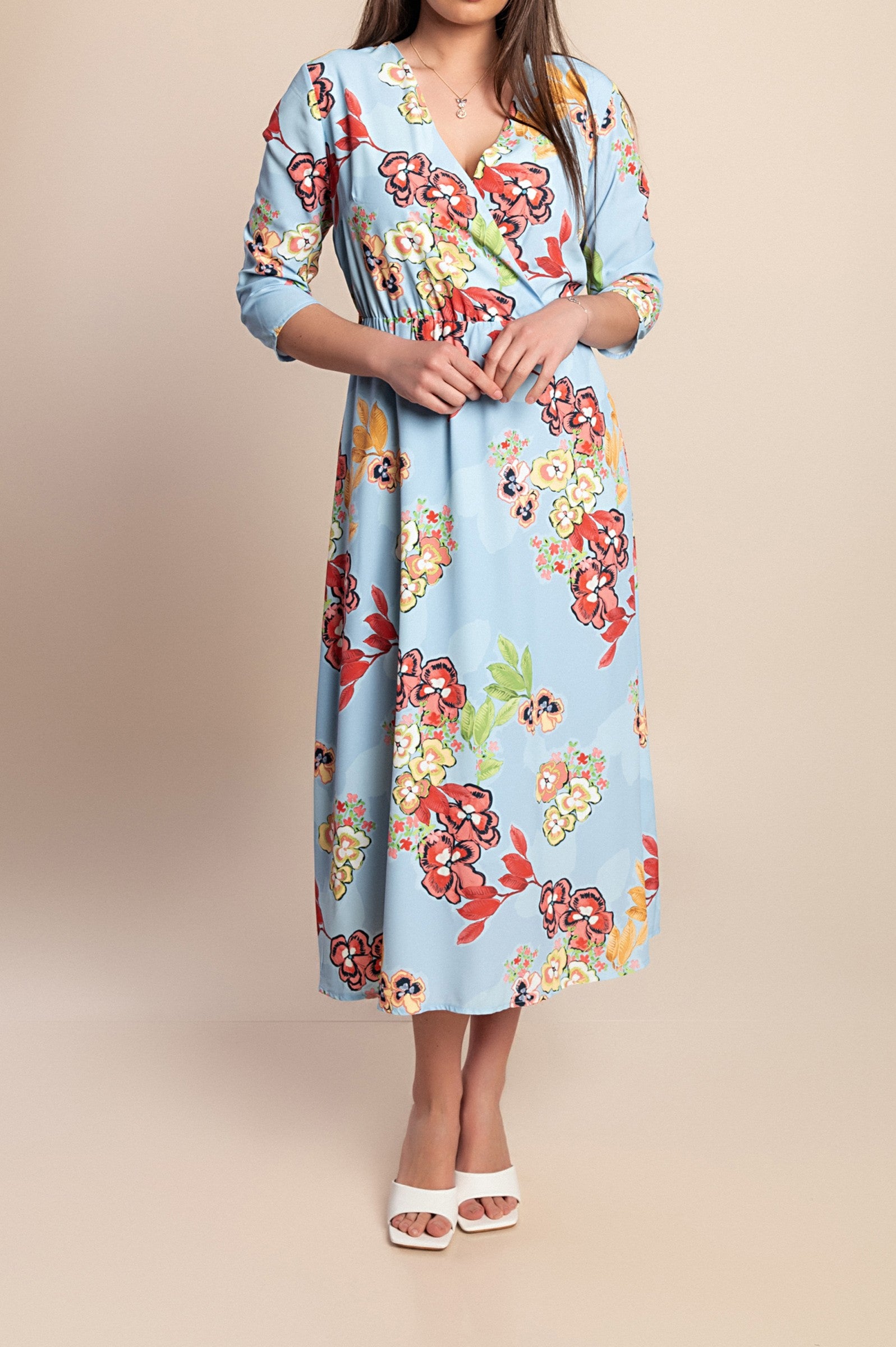 Abito lungo con stampa floreale, azzurro
