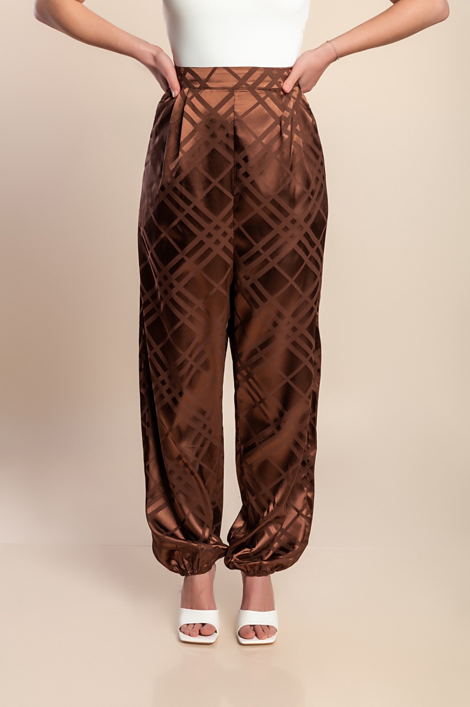 Pantaloni lunghi taglie forti in finto raso, marrone