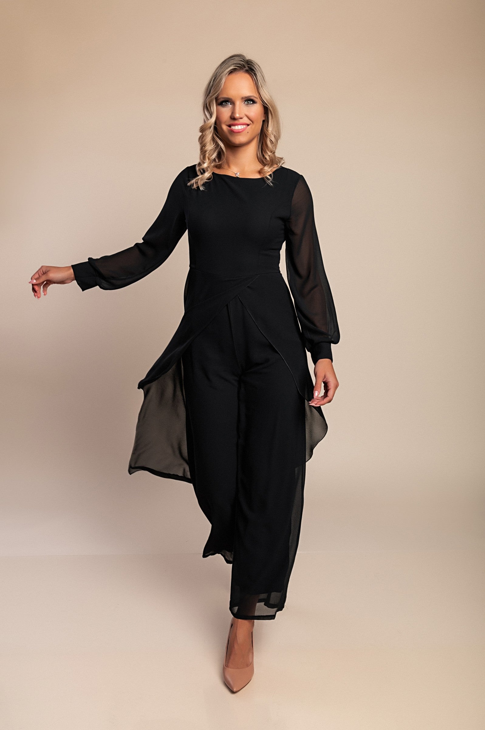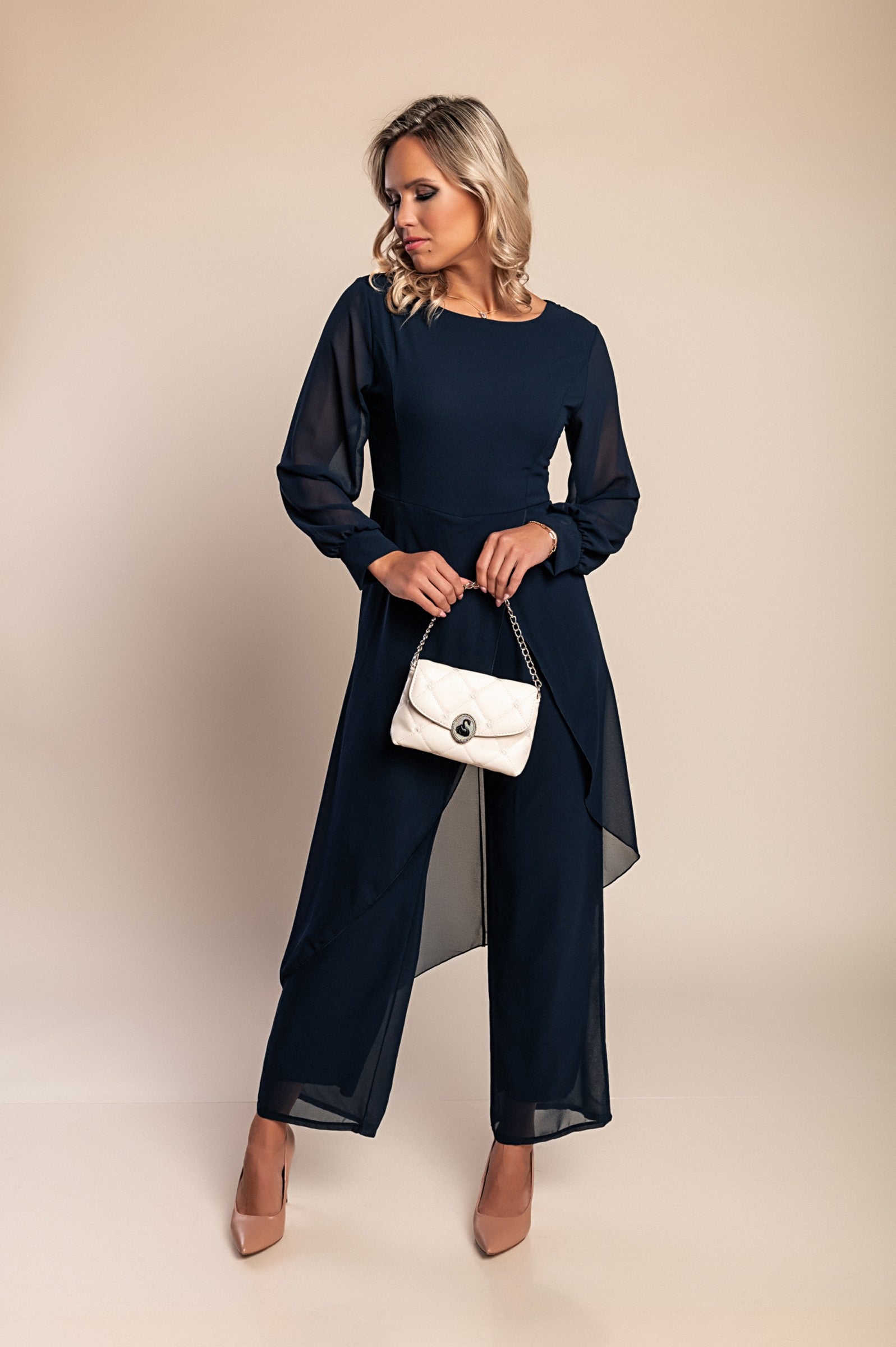L'elegante tuta è realizzata in tessuto di alta qualità che offre un comfort perfetto. La parte superiore ha una scollatura rotonda e maniche lunghe realizzate in tessuto trasparente. Pantaloni lunghi con tessuto decorativo trasparente. Codice articolo: 20831 Colore dell'articolo: blu scuro