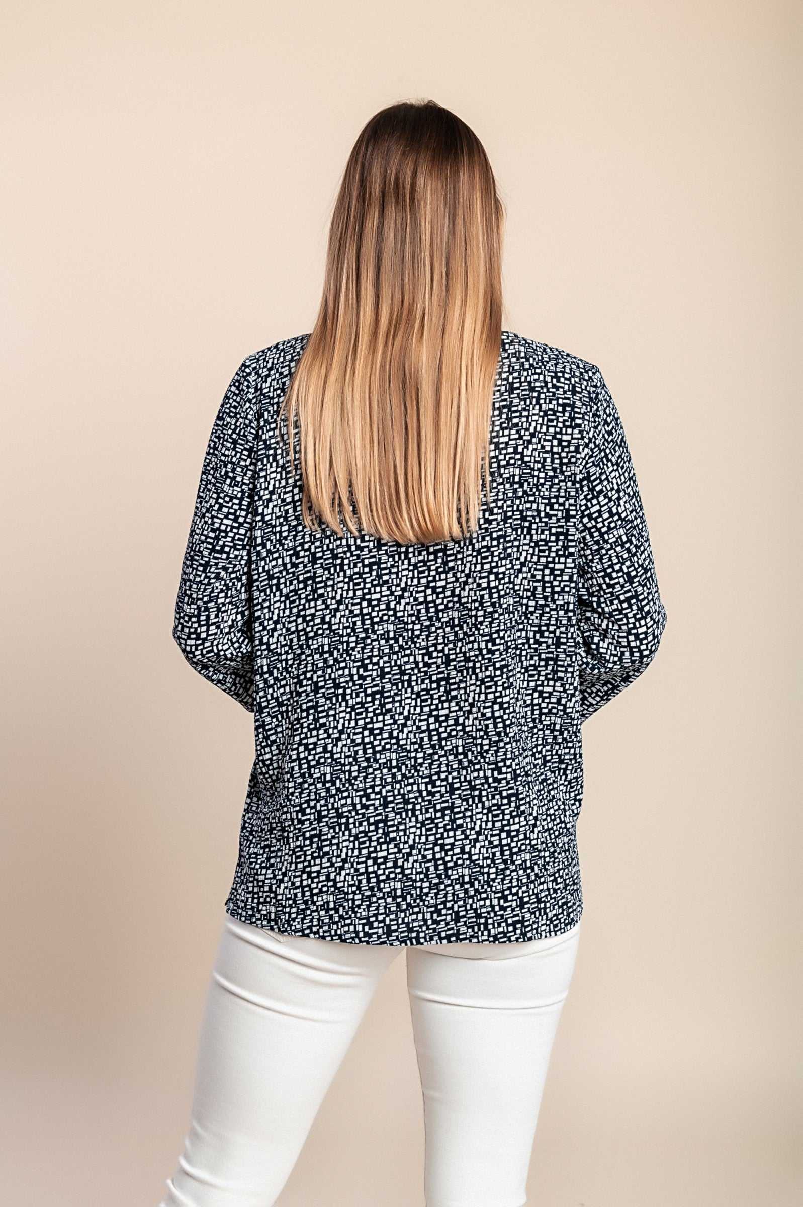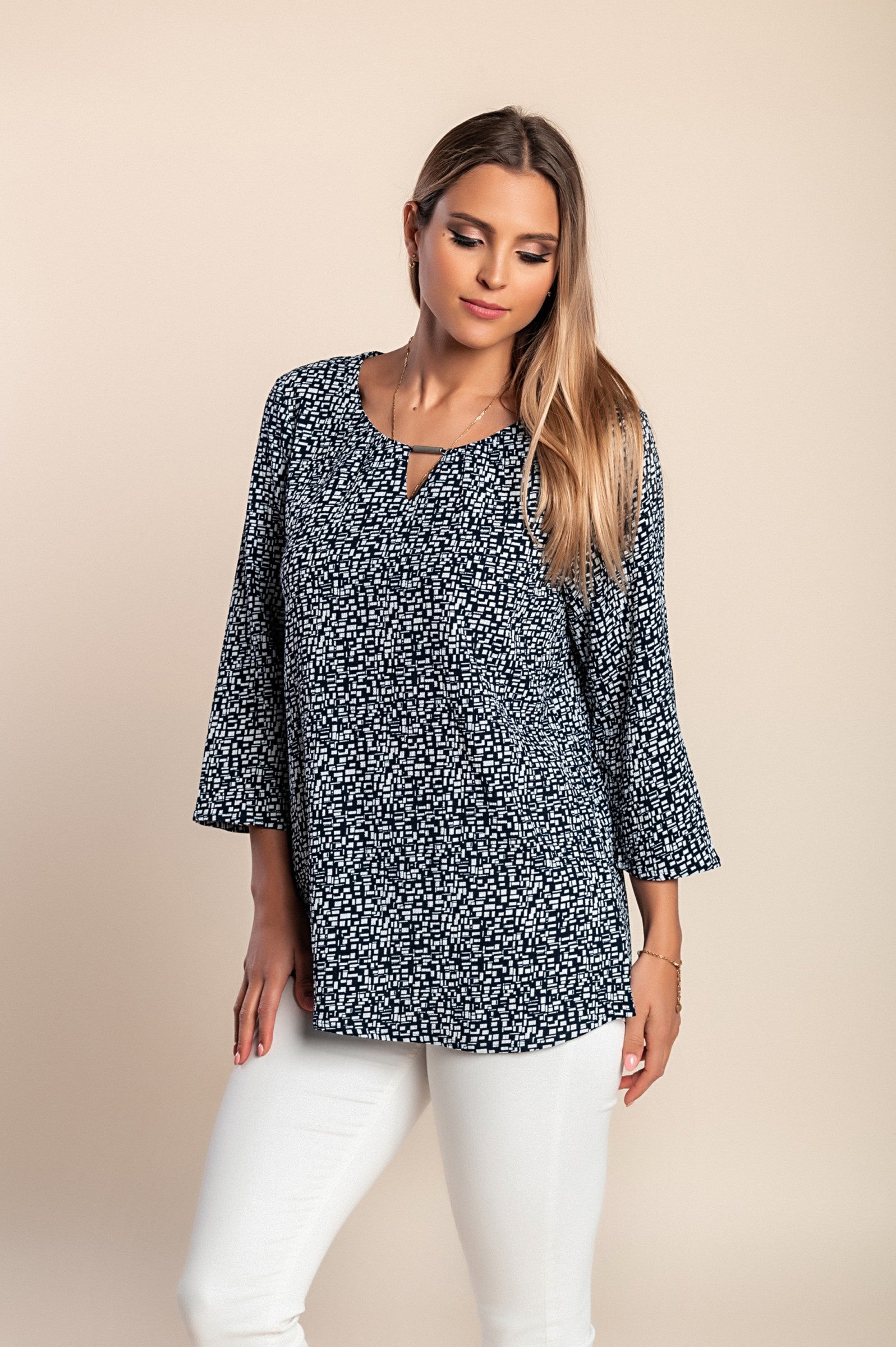 Camicetta ampia con stampa. Le taglie sono più grandi. Codice articolo: 785076 Colore: blu scuro