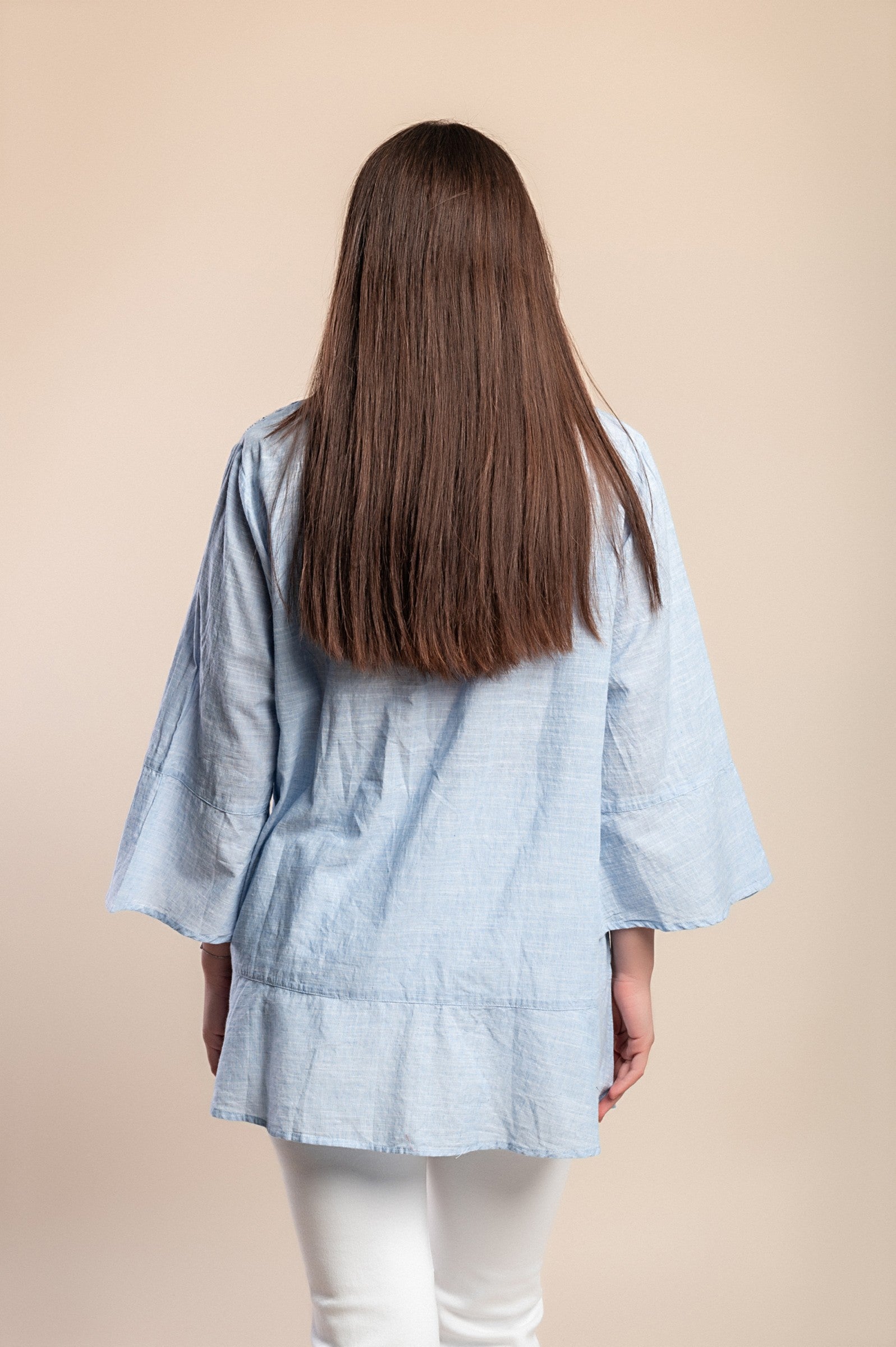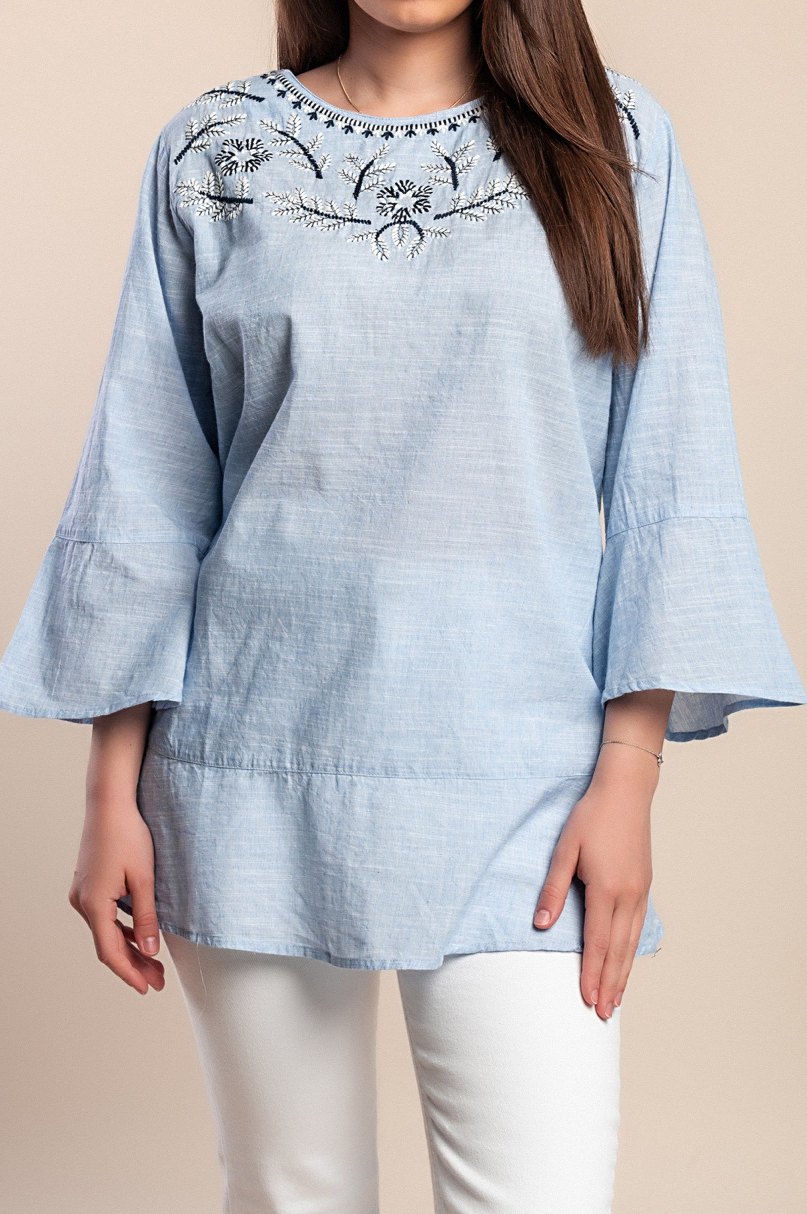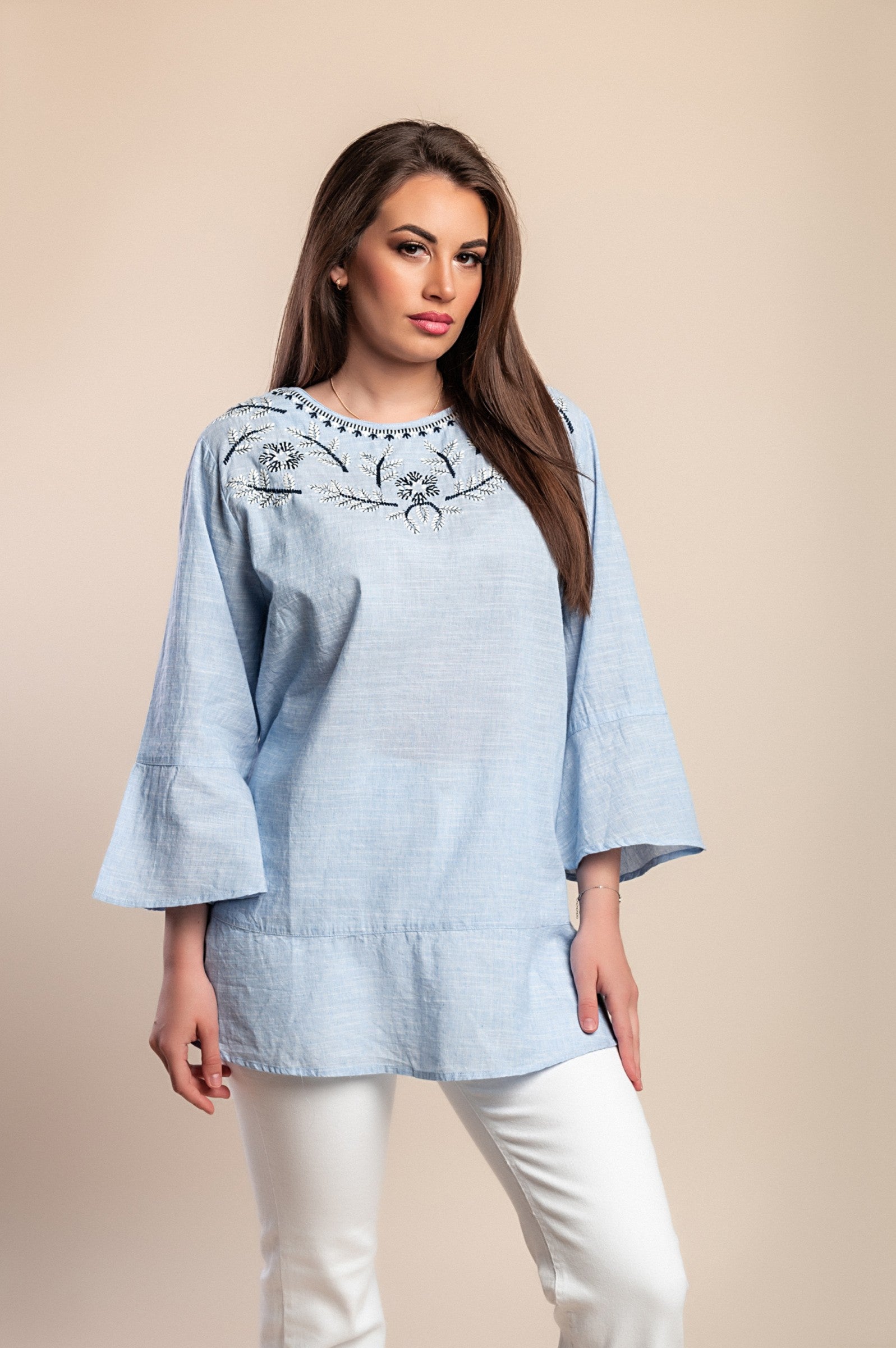 Camicetta in cotone con ricami, taglie forti, azzurra