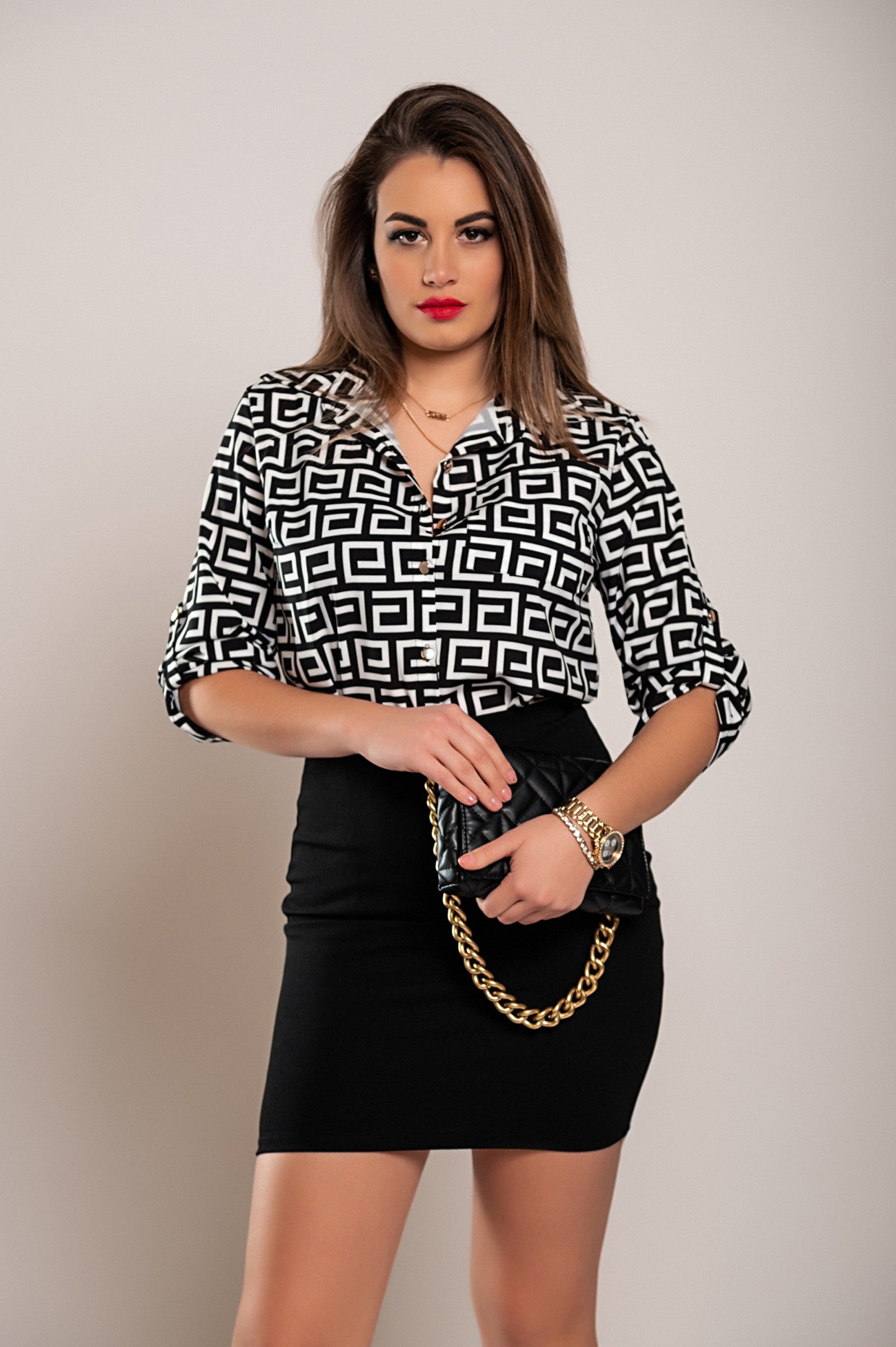 Elegante blusa con stampa geometrica Lavlenta, nera e beige
