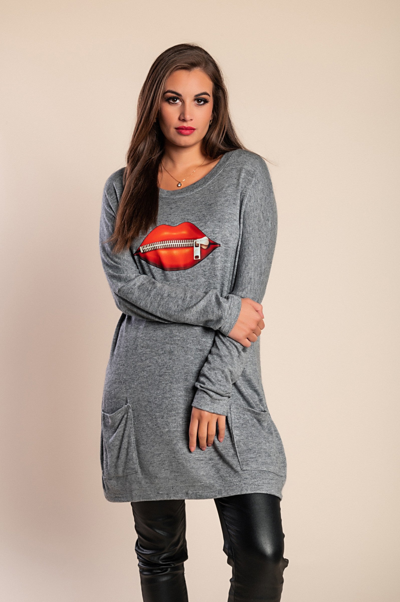 TUNICA A MANICHE LUNGHE, STAMPO ALLA MODA E TASCHE SIONA, GRIGIO