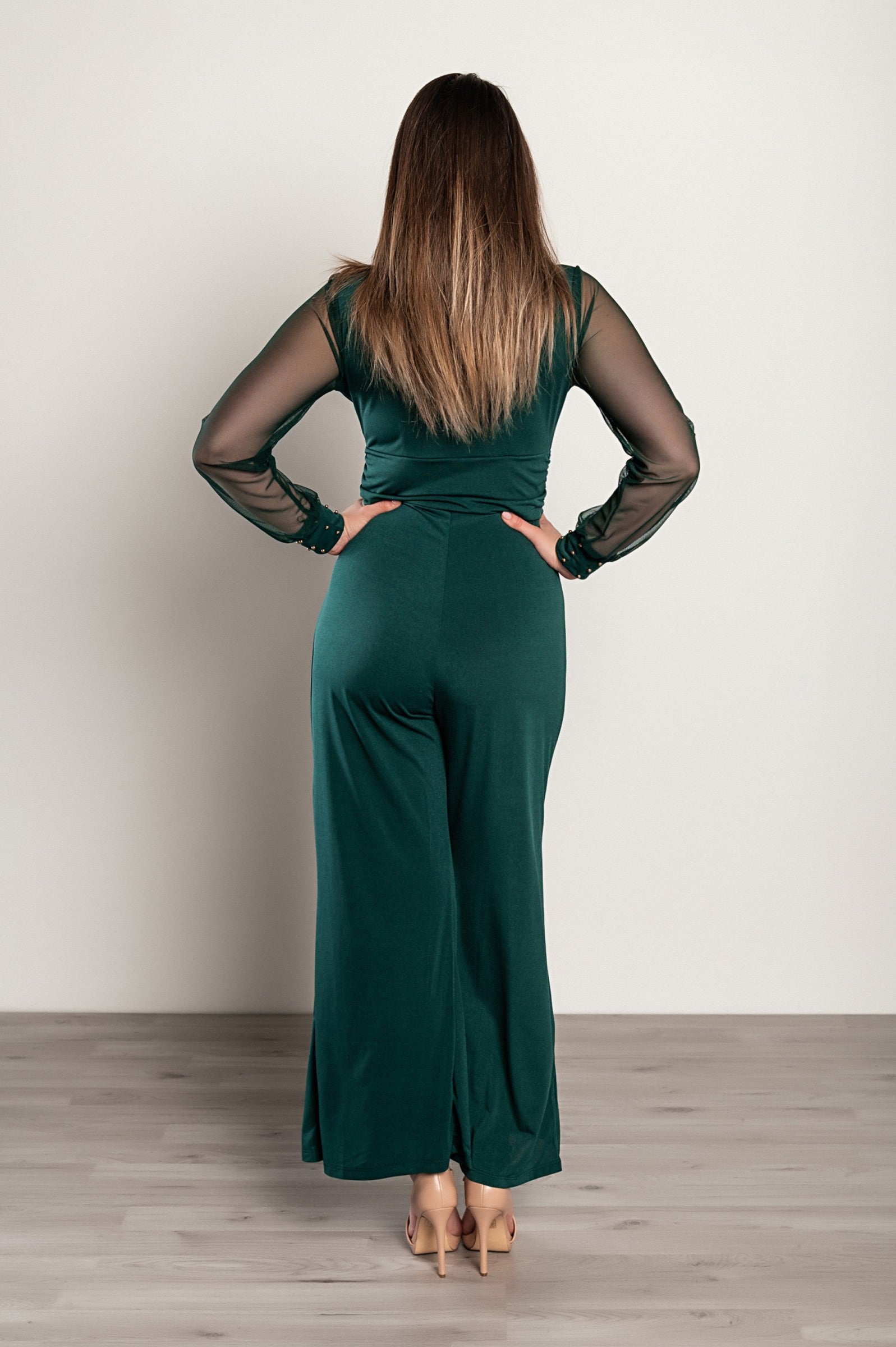 Jumpsuit elegante è realizzata in tessuto di alta qualità di poliestere ed elastan, che garantisce un comfort unico. La tuta ha una profonda scollatura e lunghe maniche trasparenti chiusa ai polsi e decorata con rivetti dorati. I pantaloni sono a vita alta lunghi e larghi. L'articolo è disponibile anche in taglie più grandi fino a 5XL ed è adatto per figure più forti. La tuta è un'ottima scelta per le occasioni dove devi essere elegante ma comoda allo stesso tempo. È completamente realizzata in Italia.