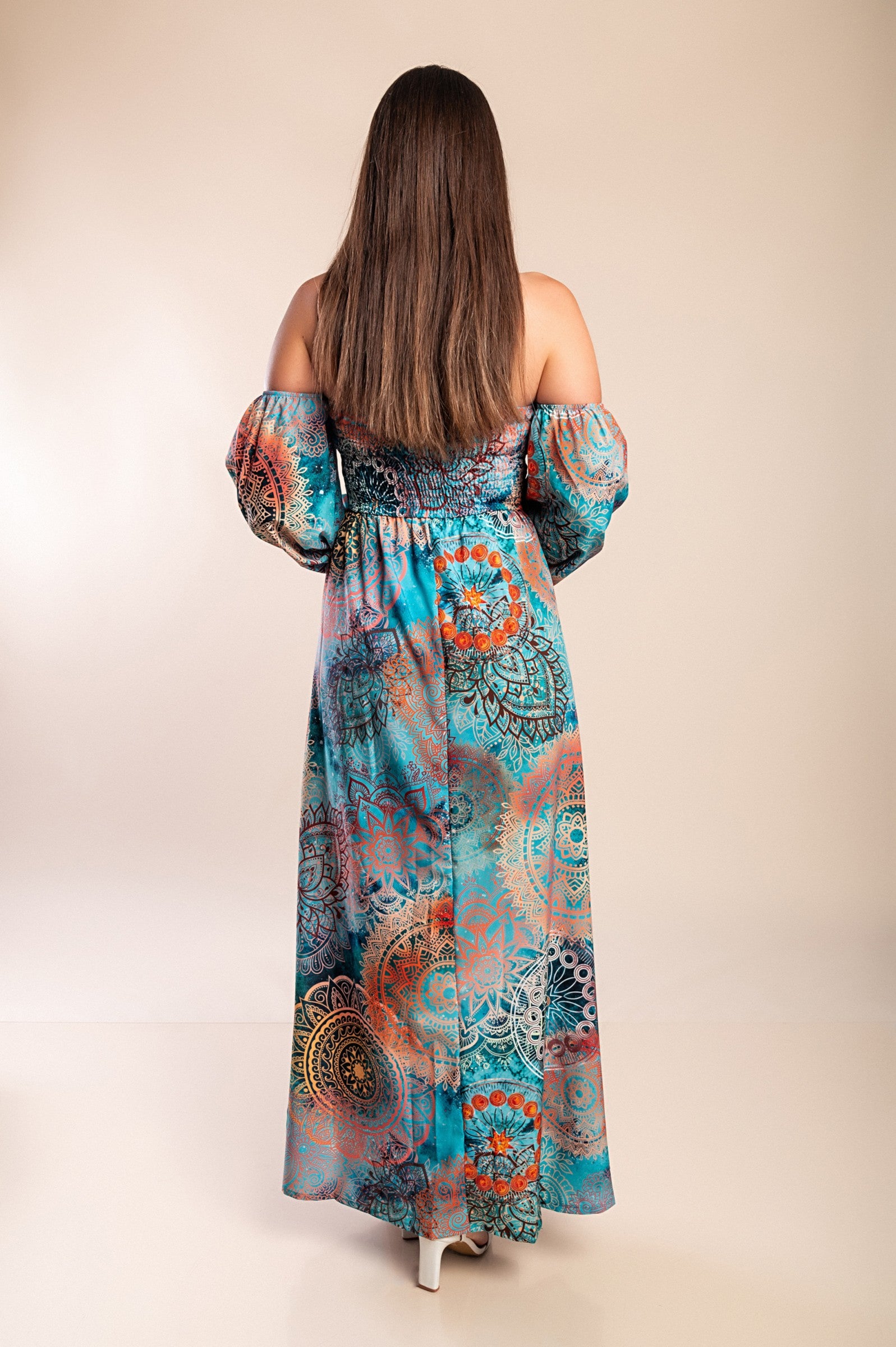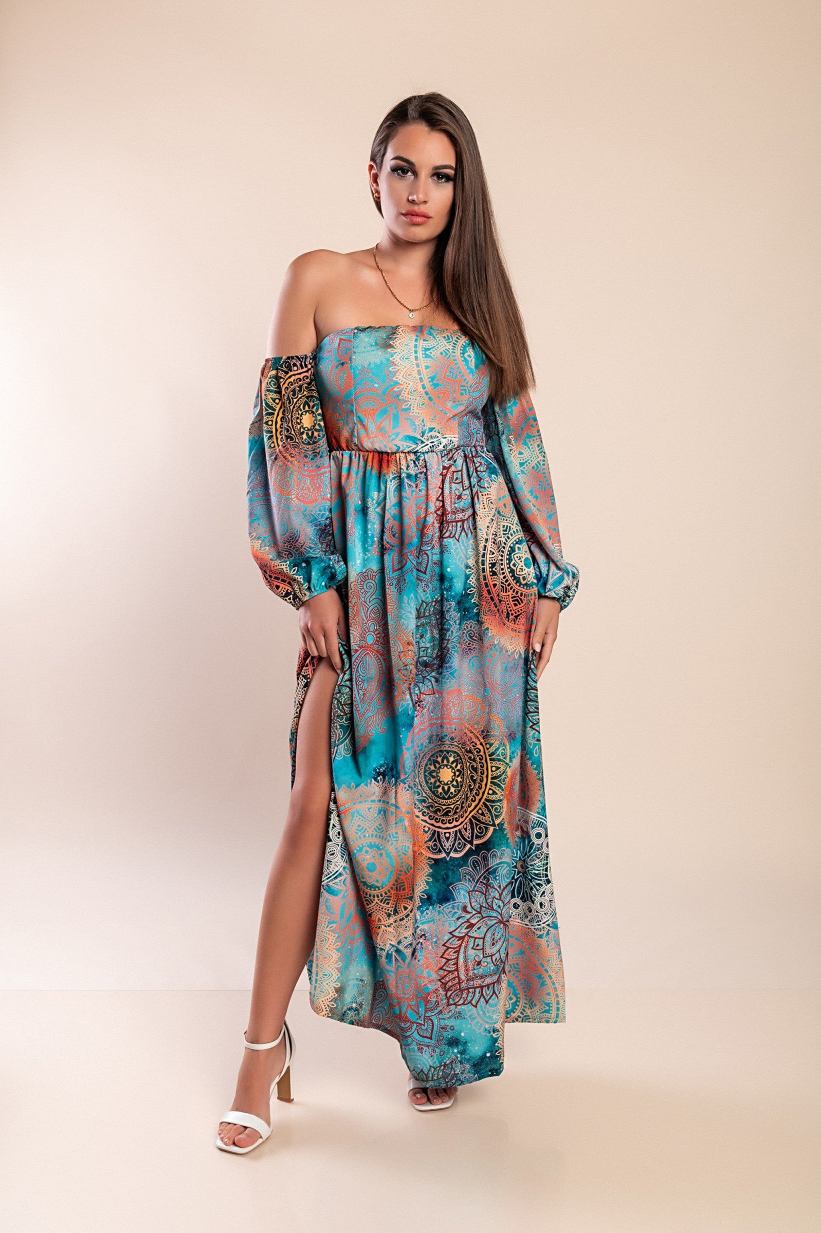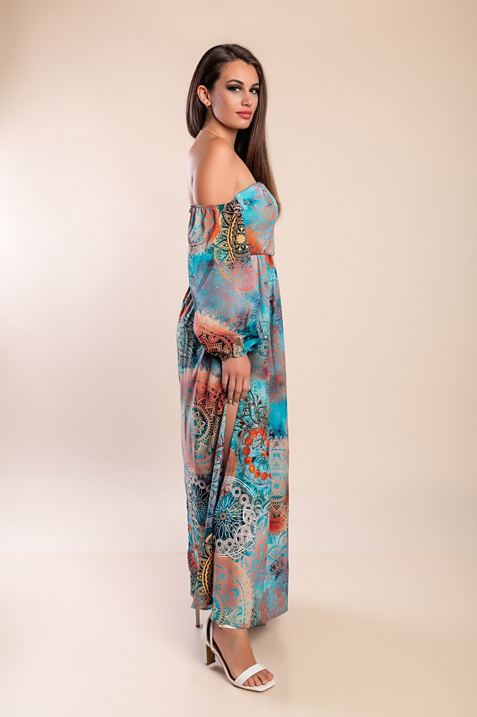Abito lungo elegante con stampa Montella, celeste