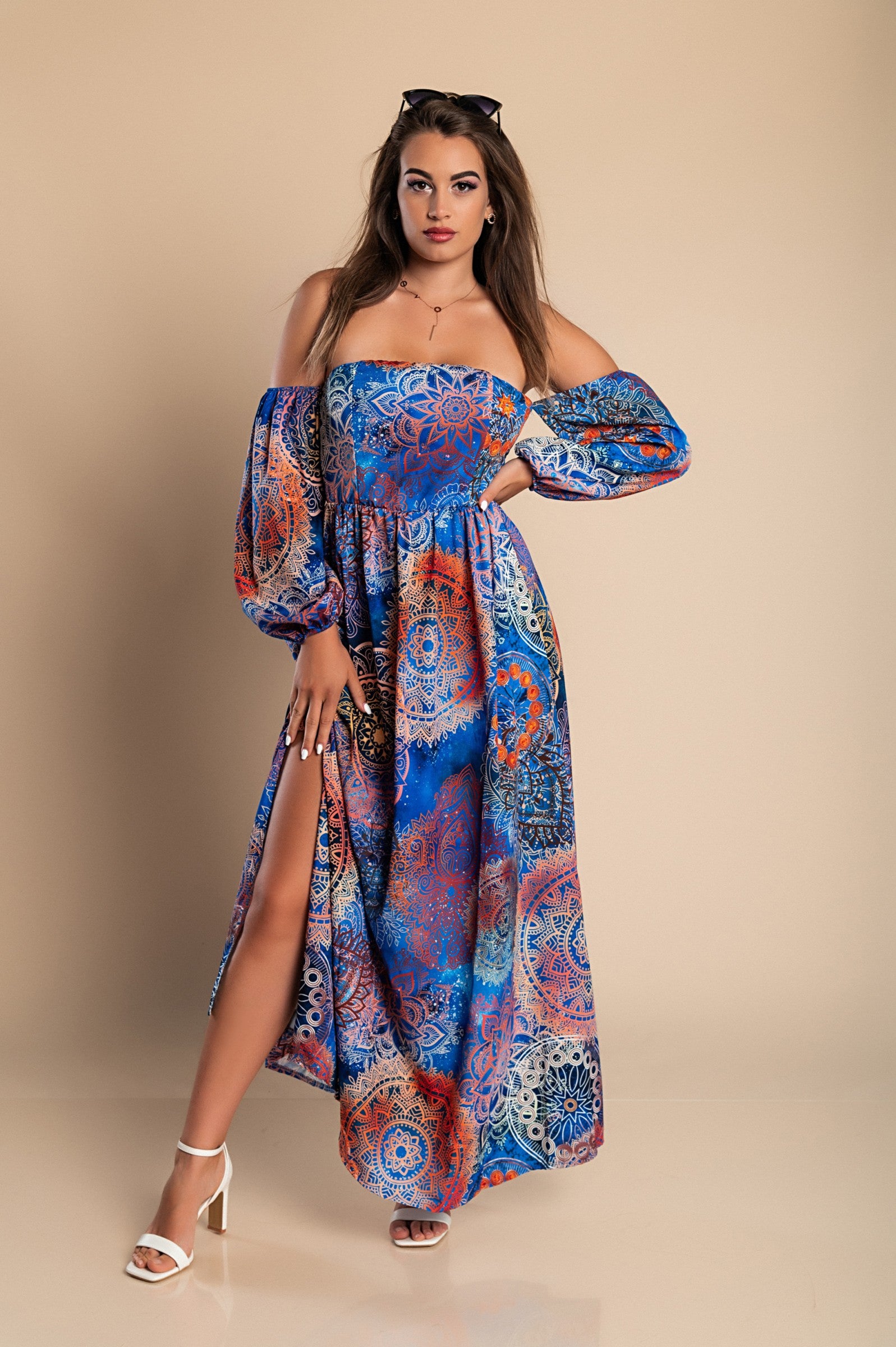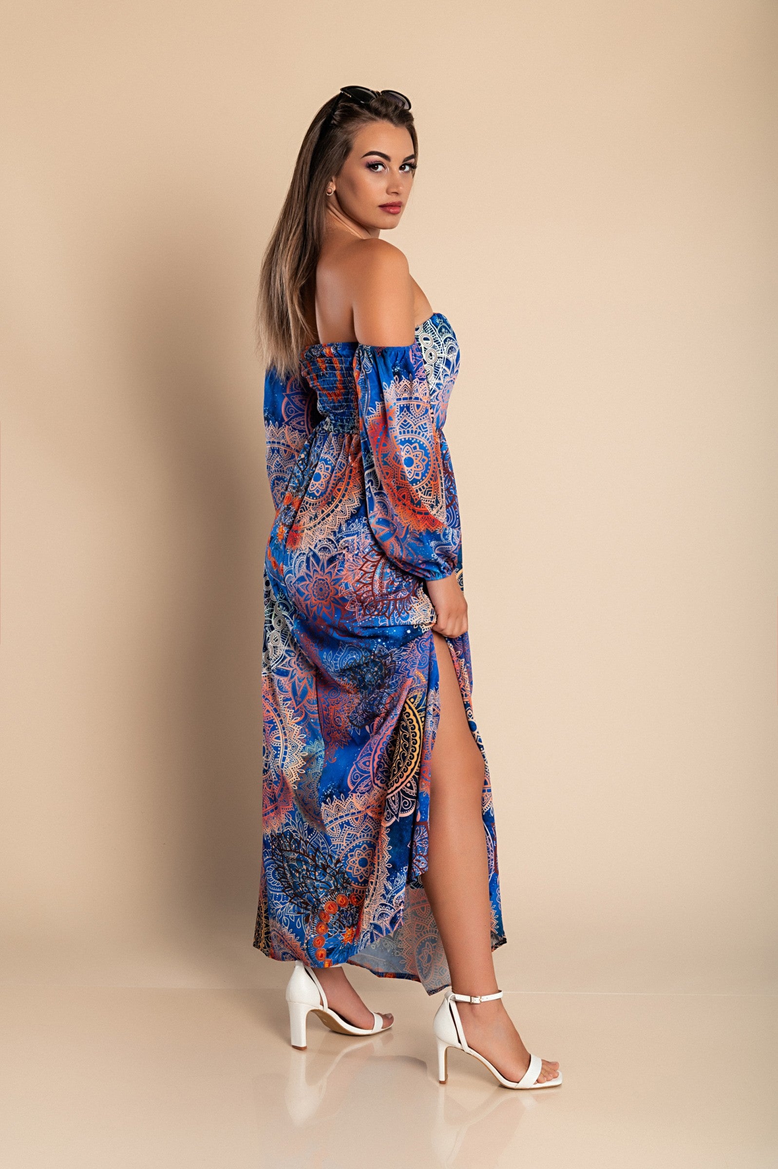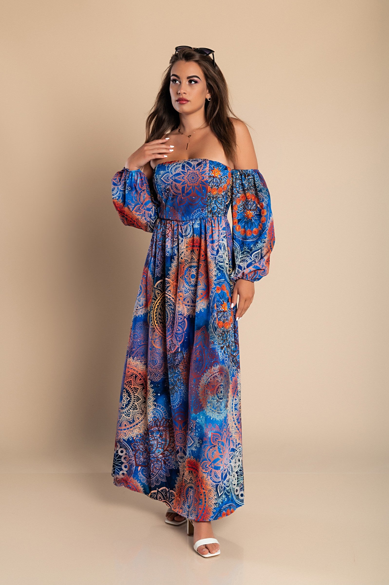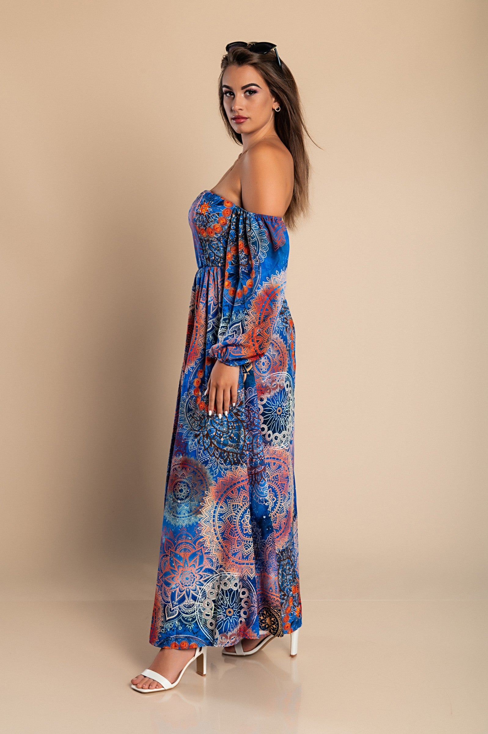 Abito lungo elegante con stampa Montella, celeste