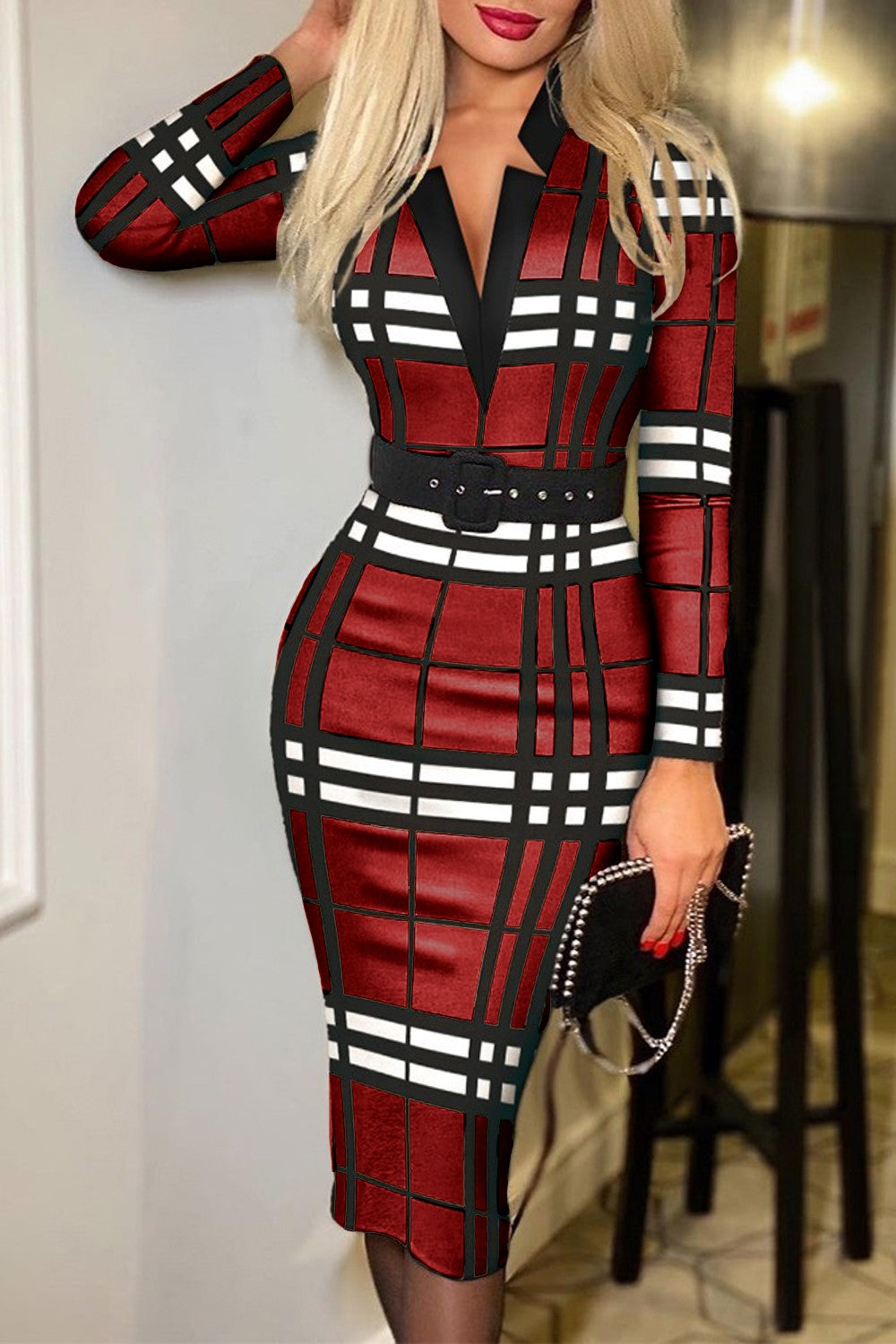Abito midi elegante con stampa a quadri e scollo a "V" Sombra, bordeaux