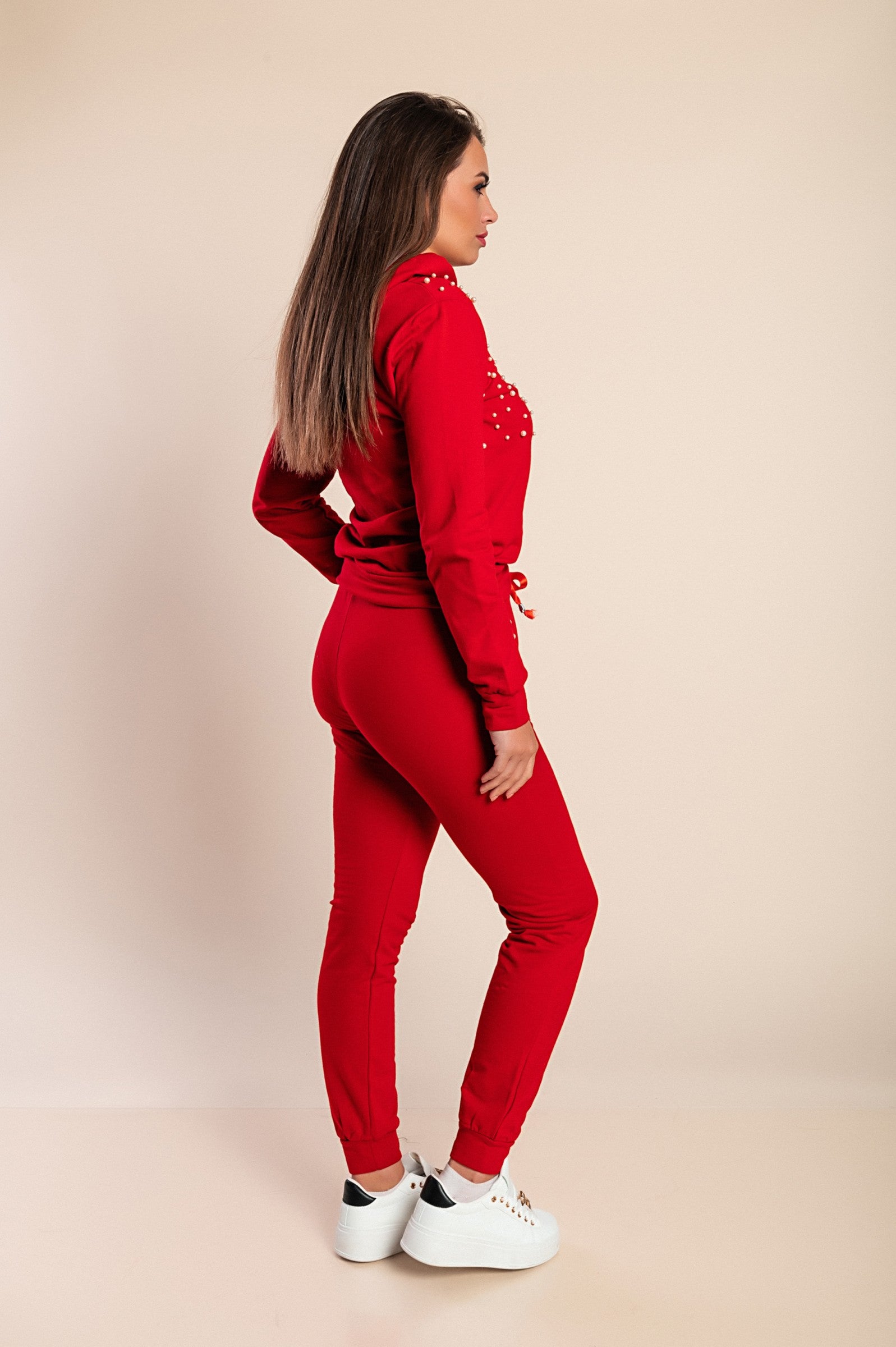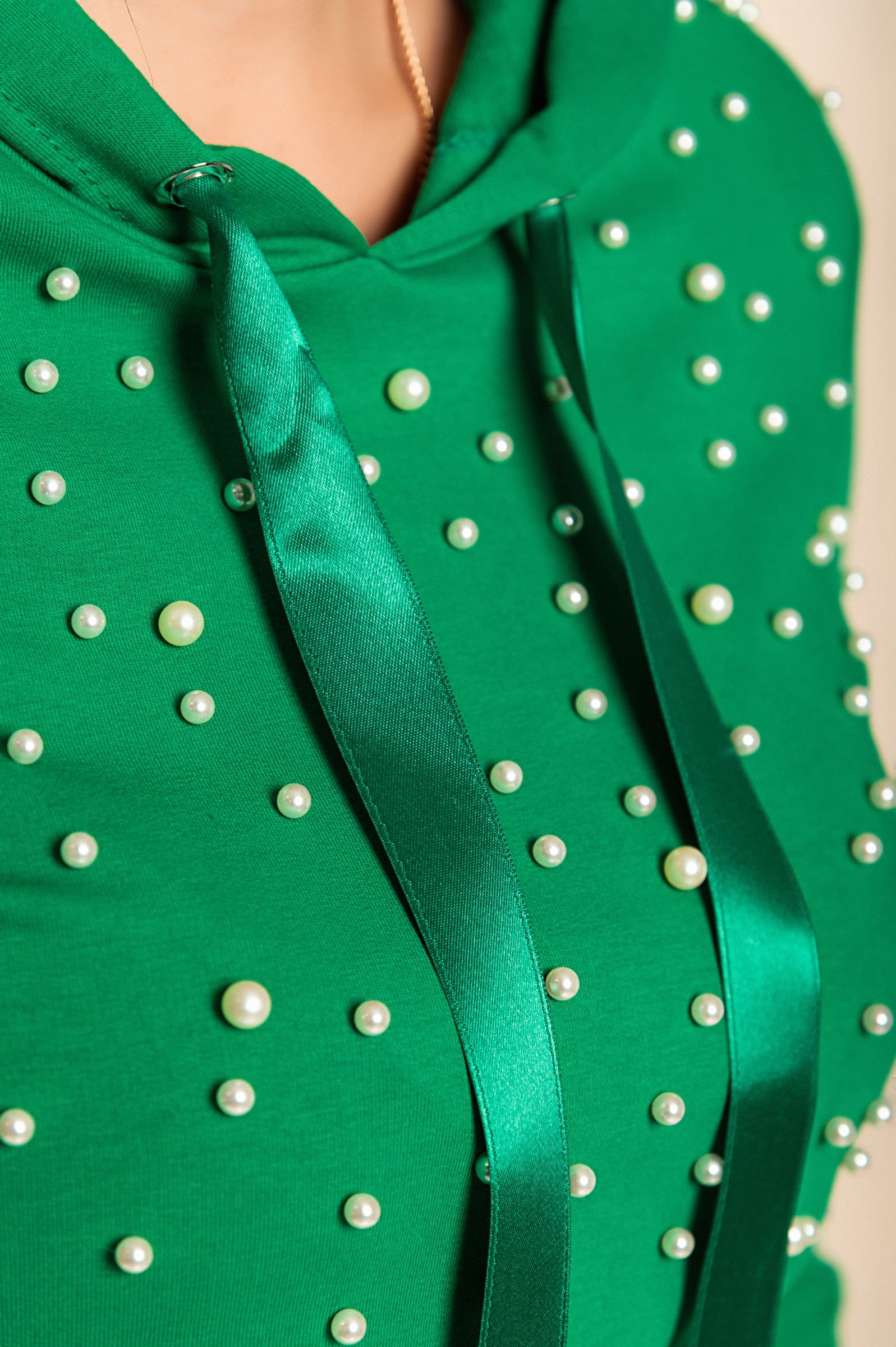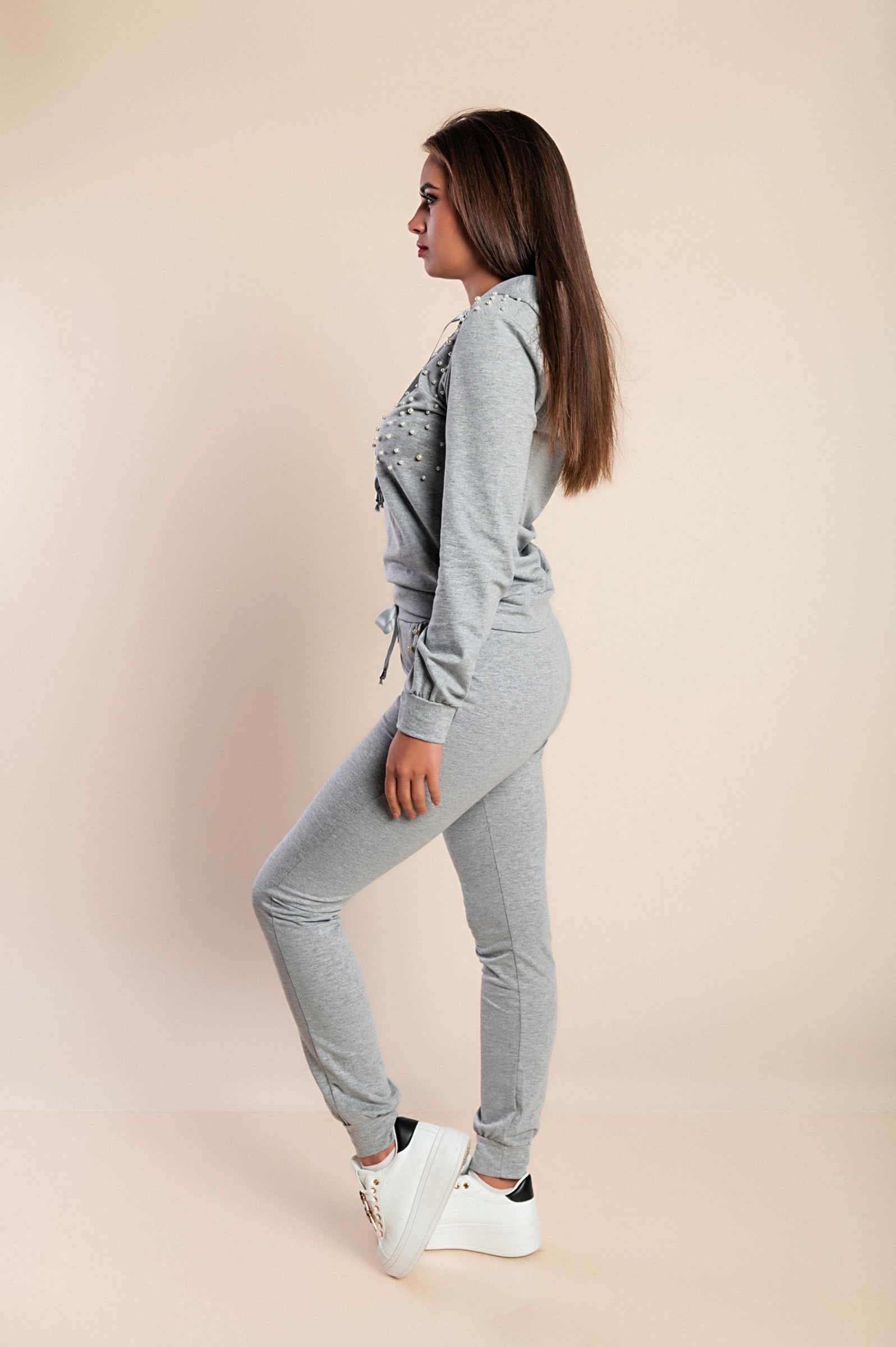 COMPLETO MAGLIETTA CON CAPPUCCIO E PANTALONE CON DETTAGLIATI DI PERLINE TINSELY, ROSA